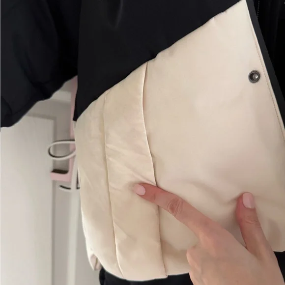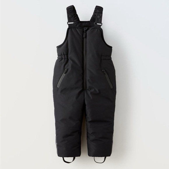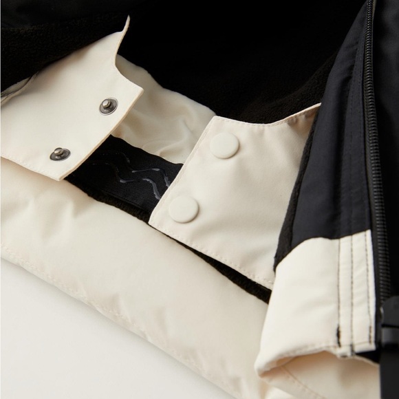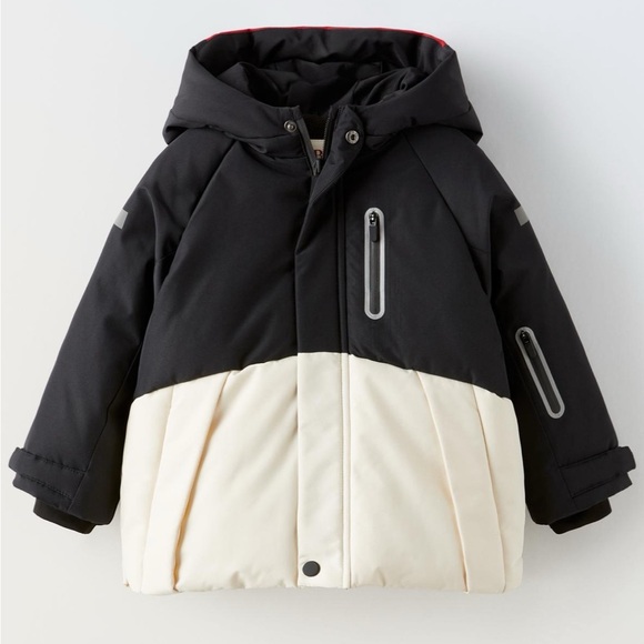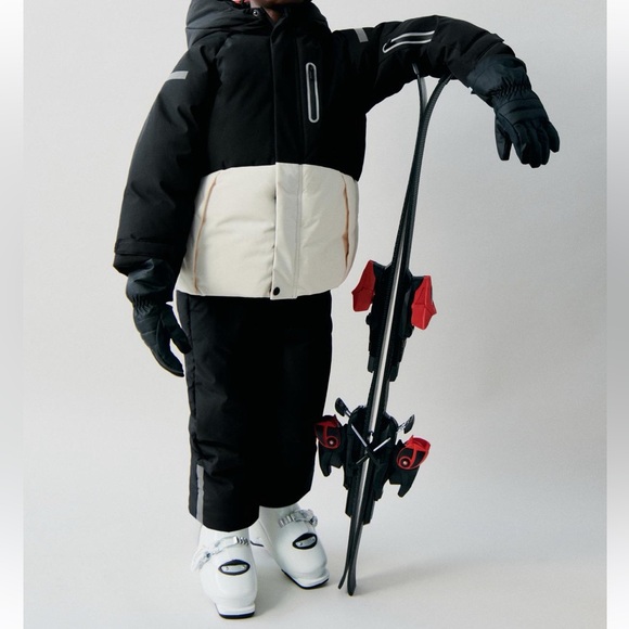 Zara Boys’ Snow Ski Jacket in black & off white with bib in black. There is some dark color rubbed off on the white part of the jacket from washing as shown. Other than that, the set is in great condition. Worn for one ski trip. Added stock photos (last 4) for better details.