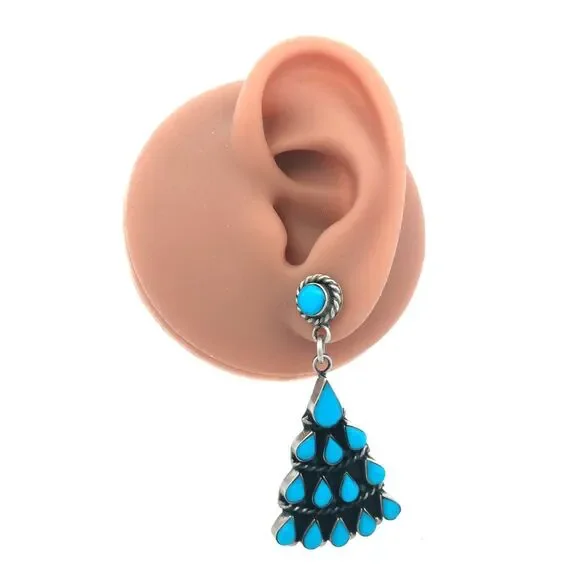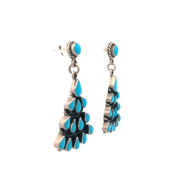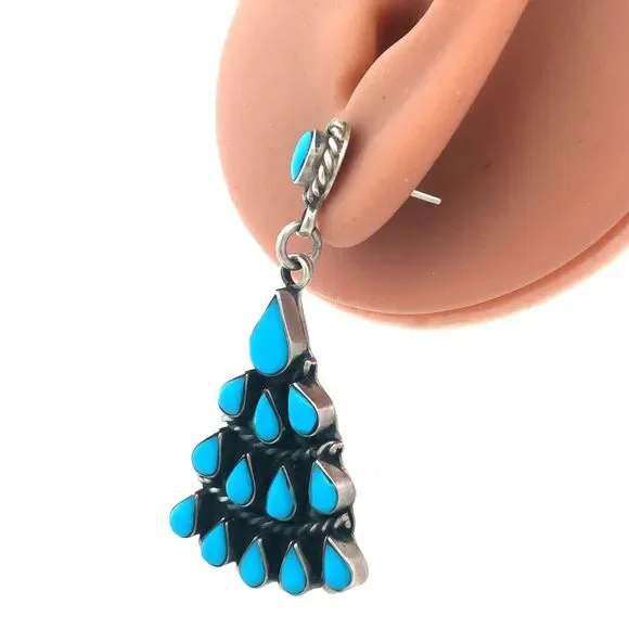 * Vintage Bernice Goodspeed Taxco 925 Sterling Silver Turquoise Dangle Earrings* Length: 2.0"* Width: 1.0"* 2 round Turquoise cabochons measure approximately 5.5 mm each* 2 pear Turquoise cabochons measure approximately 8 mm x 5 mm each* 24 pear Turquoise cabochons measure approximately 5.25 mm x 3.35 mm each* Weight: 13.5 tgw* Marked: MAKER´S MARK * 925 * MEXICO* Fastening: Butterfly-INCLUDED.* Condition: As pictured.* S6195