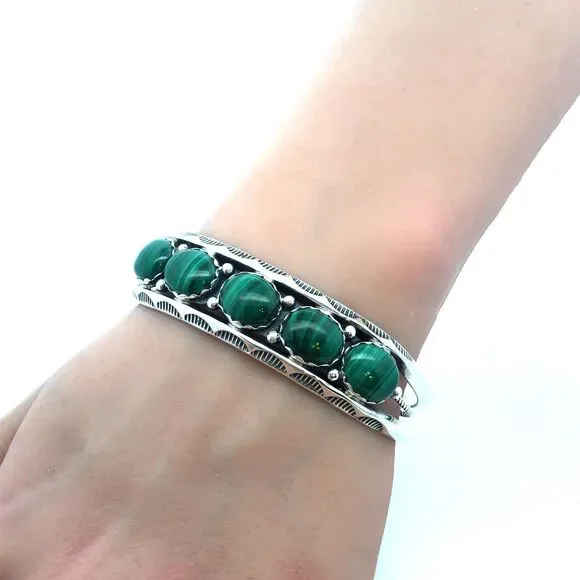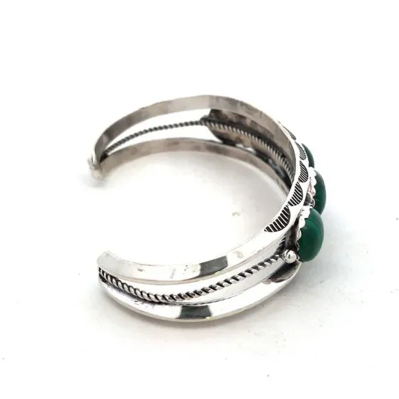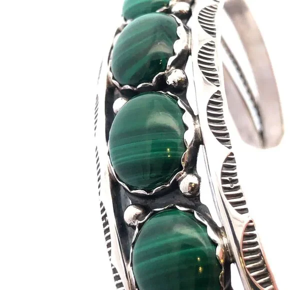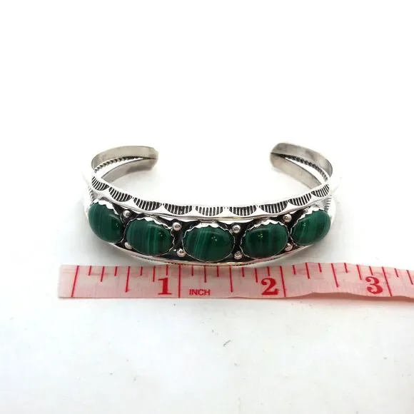 Native American L 925 Sterling Silver Oval Green Malachite Open Cuff Bracelet