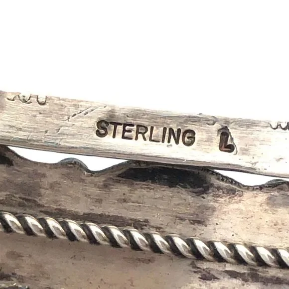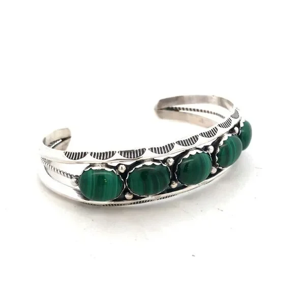 * Native American L 925 Sterling Silver Oval Green Malachite Open Cuff Bracelet* Inner cuff measures: 5-1/2"* Gap measures: 1-5/26"* Top of cuff width: 3/4"* Weight: 34.2 tgw* 5 Oval Malachite measure approximately 12 mm x 10 mm each* Marked: L * Sterling * Condition: As pictured. ( TH )* S6274