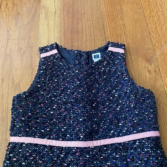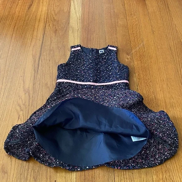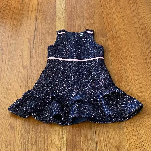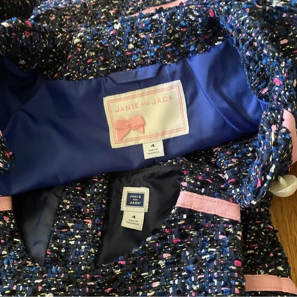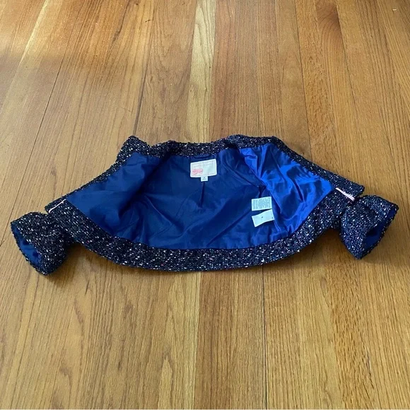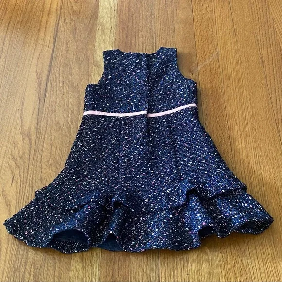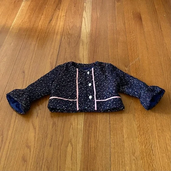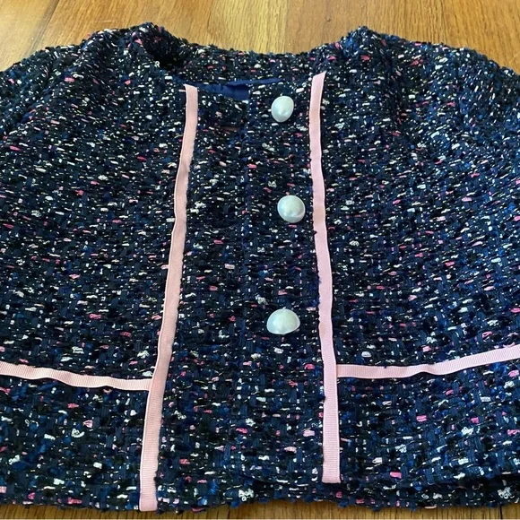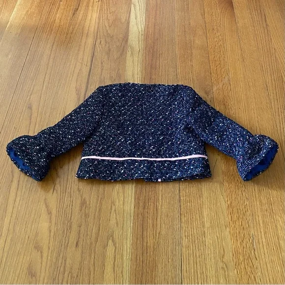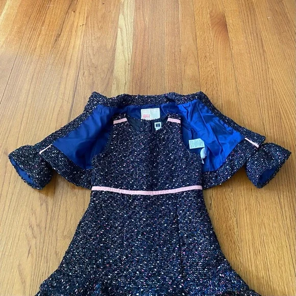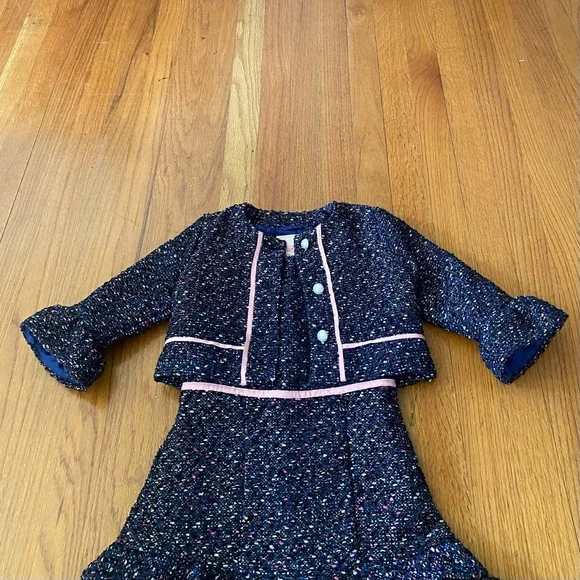 Chic navy tweed set with pink accents. Includes jacket and Ruffle dress.Perfect for stylish outings.Used once for pictures only (Not tag)but in excellent condition. Size 4