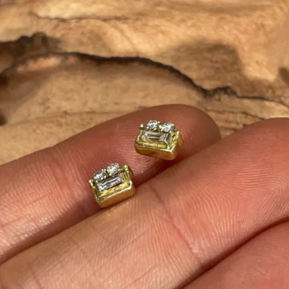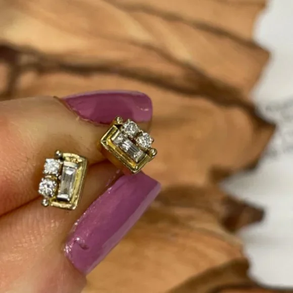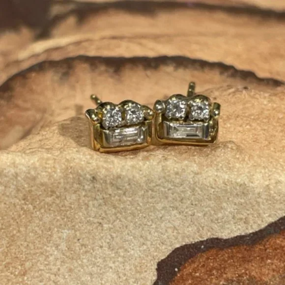 Super Cute and Unique Baguette and Round Diamond 14K Yellow Gold Stud EarringsThe earrings have .15 carats of natural diamonds, baguette and round.Natural and untreated.5x4mmMarked 14KWeighing 1.2 gramsShips with backs for the posts