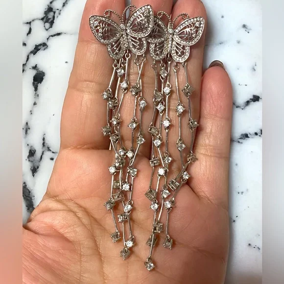 GORGEOUS Sterling Silver 925 EXTRA LONGBUTTERFLY Dangle Crystal Earrings!