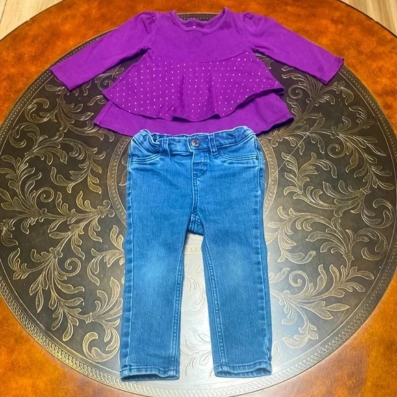 Girls Bundle Jeans, 2 Blouses Jumpsuit Long Sleeve Thermal Top Sizes 12-18 Months Denim Blue Jeans, cotton polyester spandex blend, gently worn, excellent condition, size 12M.Garanimals purple long sleeve blouse, 100% cotton, new without tags, mint condition. Size 12MWonder Nation animal print turquoise dress blouse, long sleeve, 100% cotton, new without tags, mint condition, size 12M.Okie Dokie green long sleeve thermal top, “Dream Big” embroidery, 100% cotton, gently worn, excellent condition, size 18MGymboree floral print thick jumpsuit, 100% cotton, gently worn, excellent condition, size 12-18 MOS.
