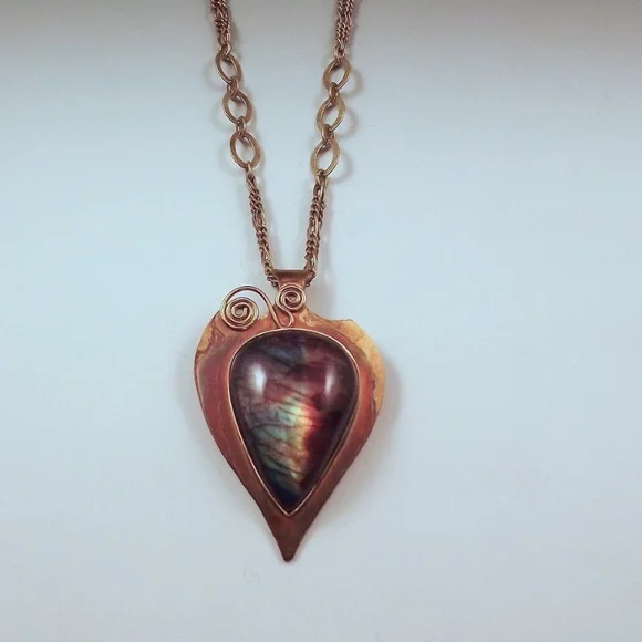 Labradorite is so intriguing!!! It has tons of colors with bright fire! It measures just over 1 1/8" x almost 7/8". Bezel set in 14kt gold fill to a Nu Gold Brass hammered and shaped . A technique was used to change the color of the metal creating a patina that goes great with the stone. A soldered 14kt gold filled design was added to the top.Total length of pendant is 2" and 1 1/4" at widest. Metal is sealed to protect finish.Adjustable length antique brass chain included with purchase- max length about 23".