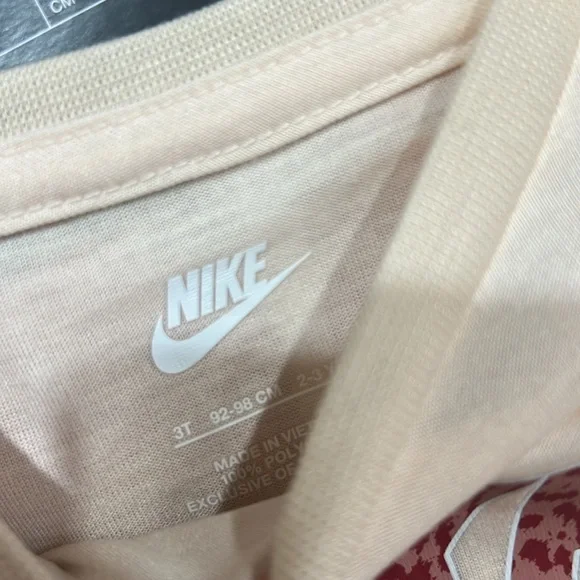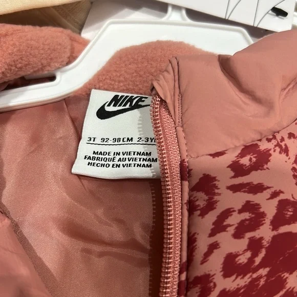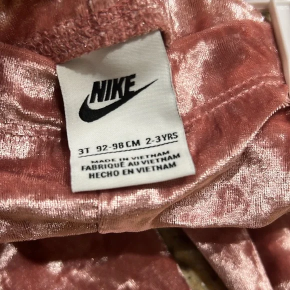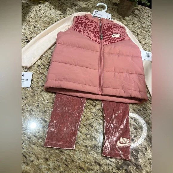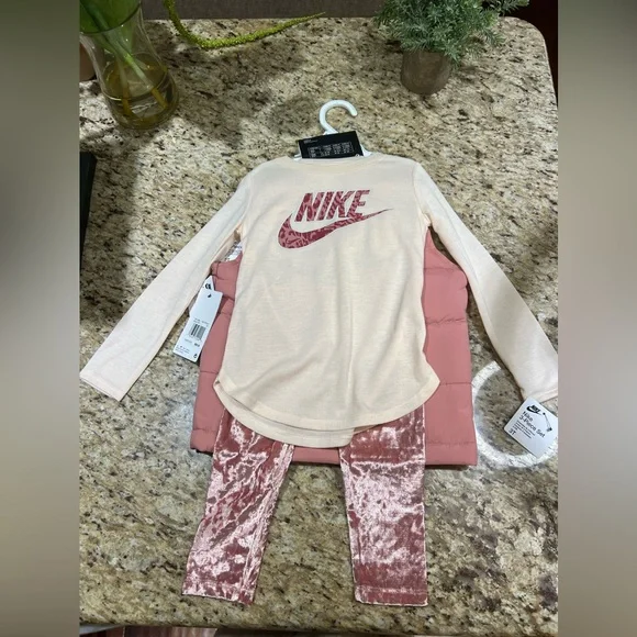 Nike Puffer Vest, Long Sleeve T-Shirt & Velvet leggings Set. Sz 3T. New w/ tag. Pink & Cream. Watch your favorite kiddo sprint in this little athletic set featuring a logo-adorned T-shirt, puffer vest and coordinating leggings. Includes T-shirt, vest and leggings. 100% polyester. Machine wash, tumble dry. Fast shipping!