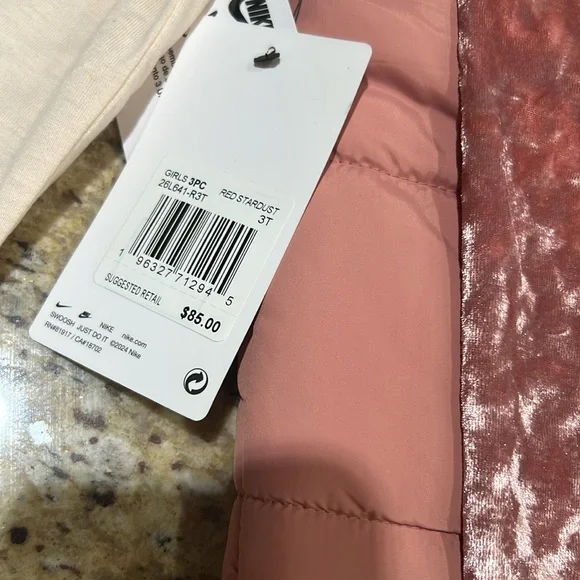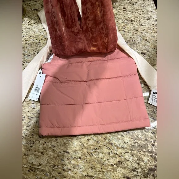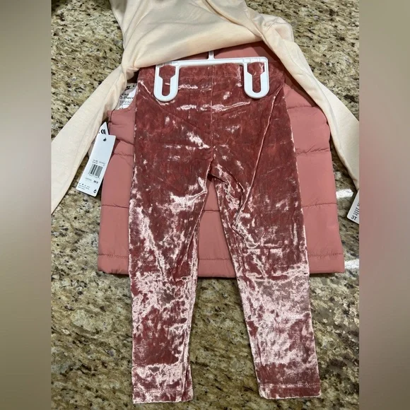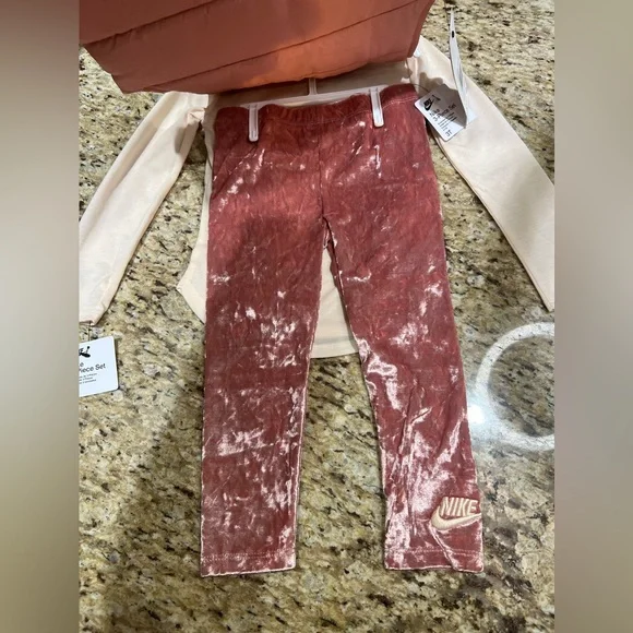 Nike Puffer Vest, Long Sleeve T-Shirt & Velvet leggings Set. Sz 3T. New w/ tag. Pink & Cream. Watch your favorite kiddo sprint in this little athletic set featuring a logo-adorned...