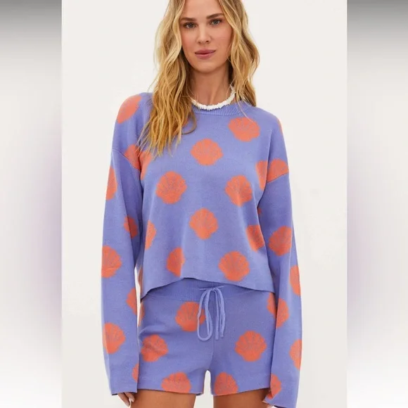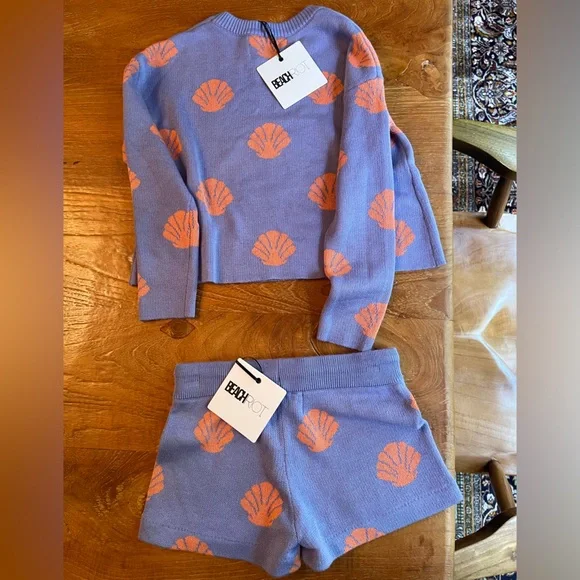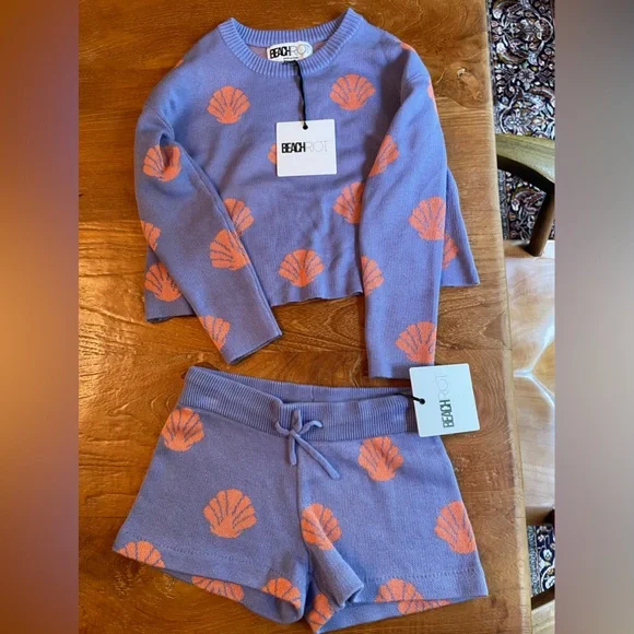 Adorable Beach Riot Siren Shells oversized sweater/shorts set; NWT; super soft. As sweater is generously sized, it is Sz 5/6 and shorts are 7/8; listing is for sweater and shorts together. Please see my closet for separate listing of Sz 3/4 kids shorts as well as matching mom Sweater Sz XS in same pattern for super cute Mommy and me matching look. Smoke free home.