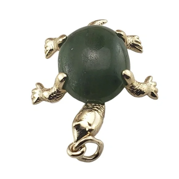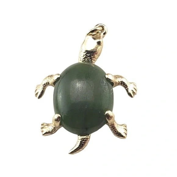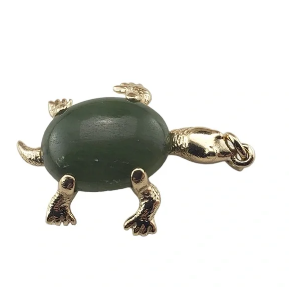 Vintage 14 Karat Yellow Gold and Jade Turtle Charm- This lovely turtle charm features one oval cabochon jade stone (15 mm x 12 mm) set in beautifully detailed 14K yellow gold....