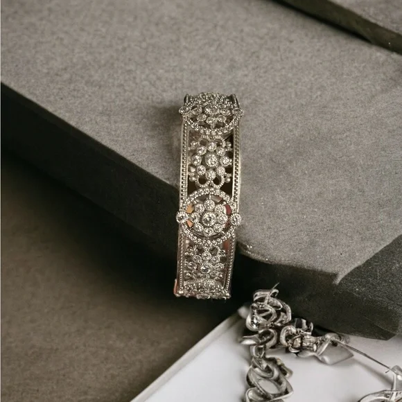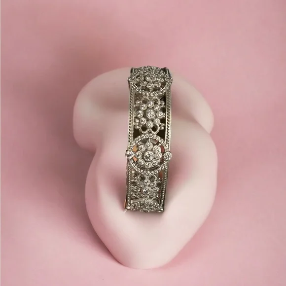 Judith Ripka Bracelet Sterling Silver Open Filigree Cuff Rhinestone Design. Excellent condition & comfortably sized weighing 263 g or 9.24oz, cuff measures 2.5 inches on the inside opens up at the bottom to allow your wrist to easily get inside of the bracelet height of the bracelet is 2.25” From the inside measures 2 cm wide a real statement piece definitely looks like diamonds and white gold