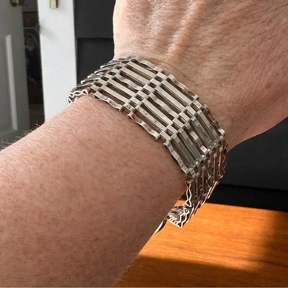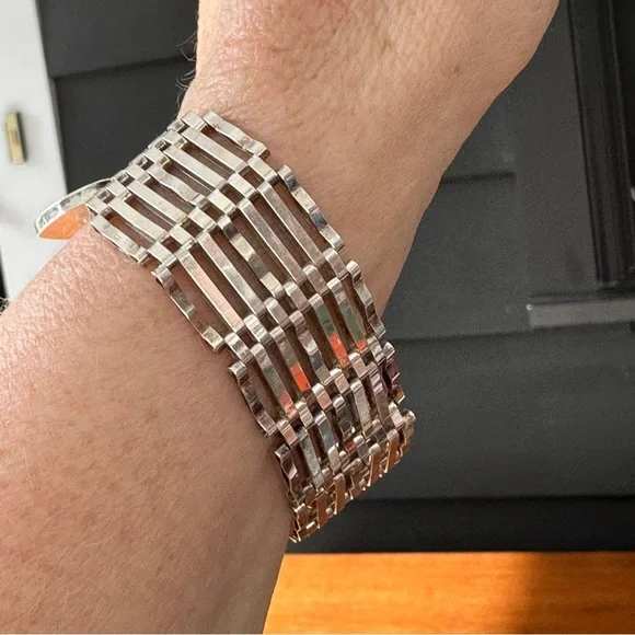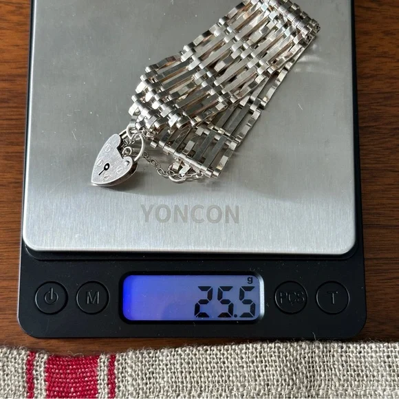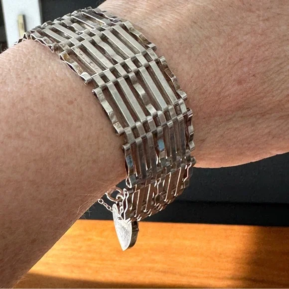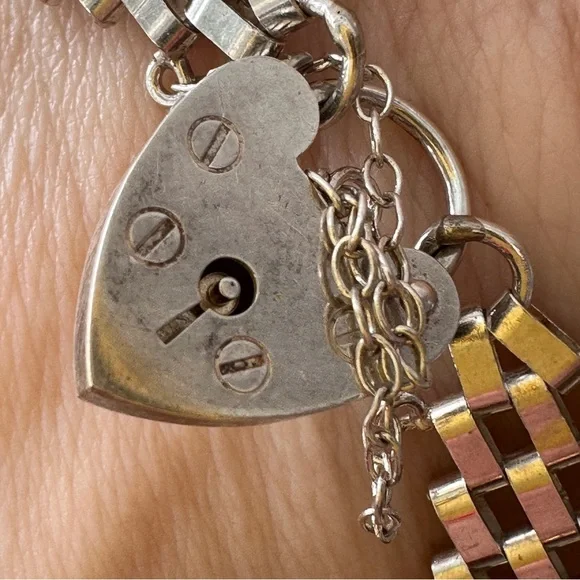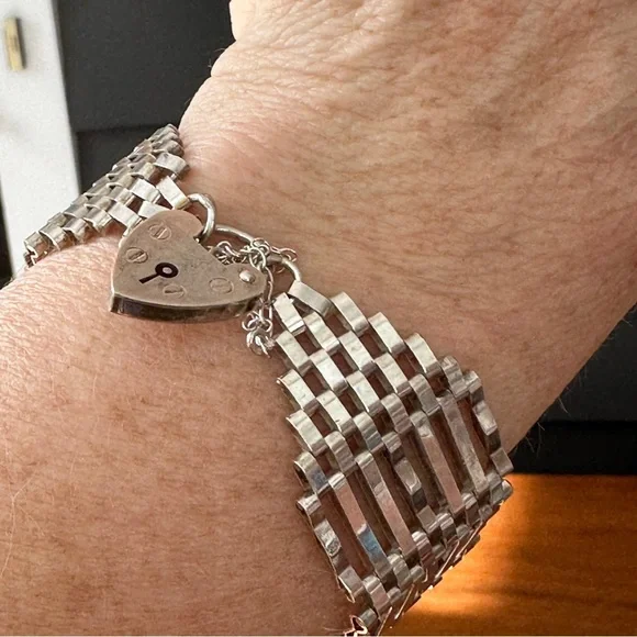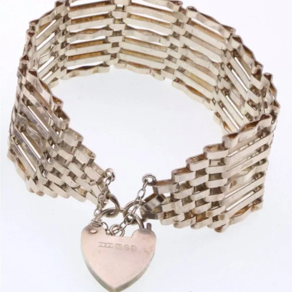 Victorian;English Sterling Silver Heart Padlock “ Gate “ BraceletThe bracelet is nice and wide with rows of 7 bars in straight and twisted barley sugar links and comes complete with a large heart padlock clasp and safety chain adding oodles to her decorative charm.Gate bracelets were great signifiers of true love during the Victorian era, although the exact origin of the design is difficult to trace. This bracelet style was meant for lovers, especially those who were destined to be apart for a long period. The padlock style fastener was only meant to be opened once they returned to each other’s arms!A gorgeous antique style sweetheart bracelet and a classic love token full of sweet sentiment!MATERIALS: sterling silver throughoutMEASUREMENTS: 7.5” in lengthGate bracelets came into fashion during the Victorian Era. The name comes from their unusual interlocked panels which are designed to resemble the gates of an English manor house. These bracelets were worn by women as a sign of fidelity and faithfulness to a husband or lover. When a man left for an extended period, such as for the army, he would lock the heart-shaped padlock and take the key with him. His wife or lover would then wear it until he unlocked it upon his return.