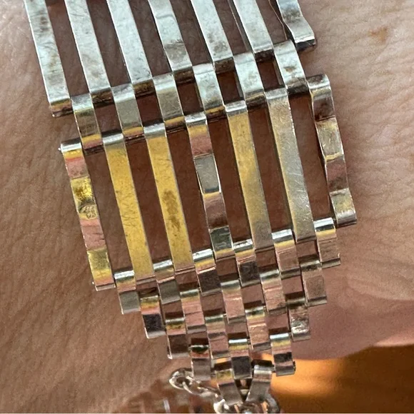 Victorian;English Sterling Silver Heart Padlock “ Gate “ BraceletThe bracelet is nice and wide with rows of 7 bars in straight and twisted barley sugar links and comes...