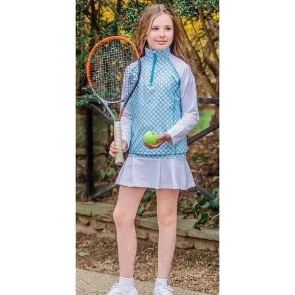 This Little Miss Tennis 3pc set in size 4/5 is perfect for active girls who love tennis. The skort, tank top, and halfzip pullover are all designed with a colorful geo print...