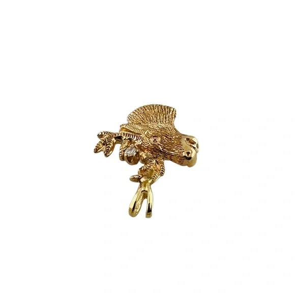 This deer head charm is set in 10K textured yellow goldA single cut diamond accents the antlersDiamond is approx. .01 ct and of I1 clarity and I colorStamped 10KMeasures approx...