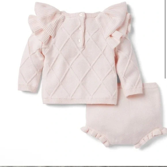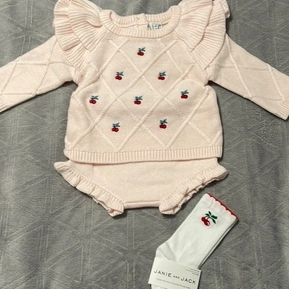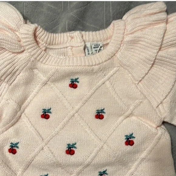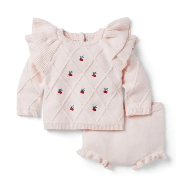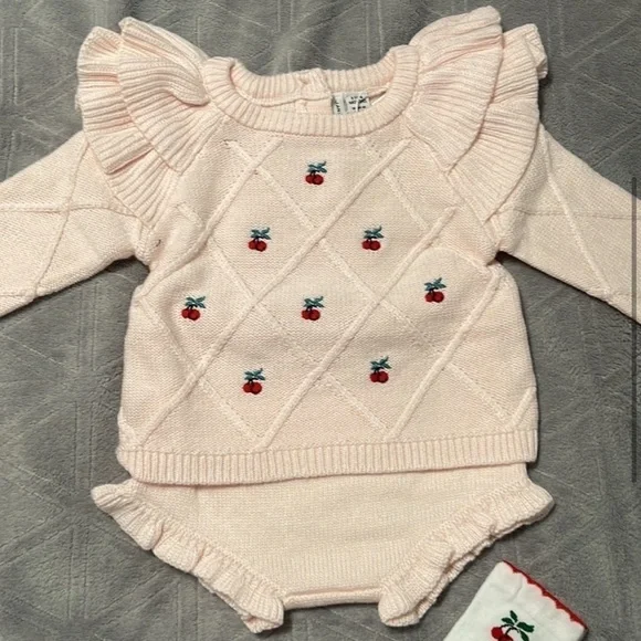 A soft matching sweater set to sweeten any day. With embroidered cherries, a diamond cable knit and ruffles details we love.55% Cotton/25% Rayon/20% NylonLong SleeveButton BackMakes The Perfect Gift For Baby