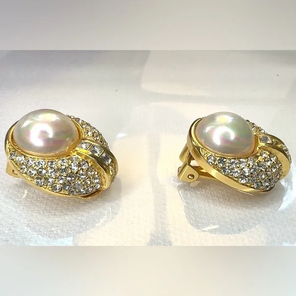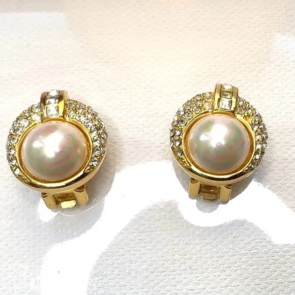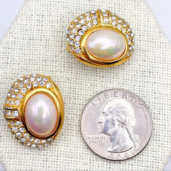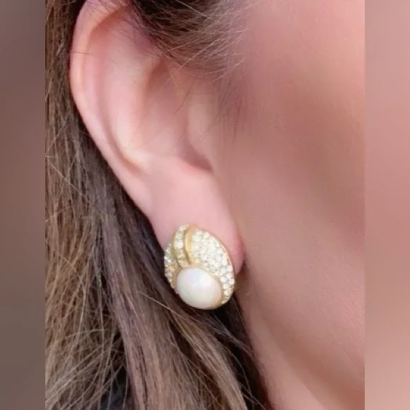 Stunning vintage huggie clip earrings signed by Christian Dior. An oval pearl cabochon set in gold and surrounded by clear rhinestones. Classic and elegant.They are 1 inch long...