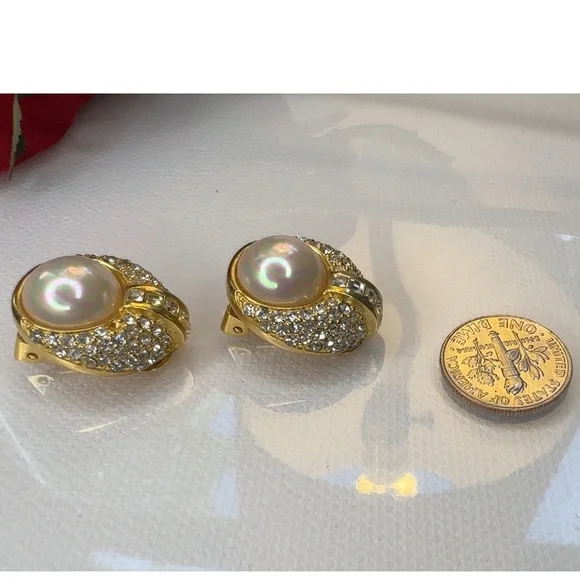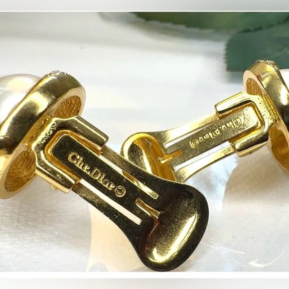 Stunning vintage huggie clip earrings signed by Christian Dior. An oval pearl cabochon set in gold and surrounded by clear rhinestones. Classic and elegant.They are 1 inch long and 3/4 inch wide. In excellent condition and bearing the Christian Dior stamp on the back.CHRISTIAN DIORChristian Dior launched his fashion house in 1947 and from the beginning designed jewellery to complement the ´New Look´ clothing he was creating. He used only the most talented and reputable companies to manufacture his jewellery designs.You´ll see pieces for Dior by Kramer, Mitchel Maer,and Grosse. All items were signed and many were dated. DOES DIOR JEWELLERY HOLD ITS VALUE?Christian Dior fashion jewellery is well worth collecting.Dior jewellery is renowned for its quality and craftmanship as well as its pleasing designs and innovative use of art glass and crystals.The market for midcentury Dior jewellery is exploding at the moment with prices climbingas pieces become increasingly difficult to find.Dior jewellery from the 1970s onwards is quickly following the upwards trajectory.