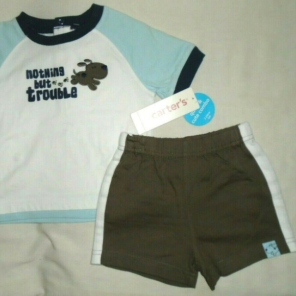 Quick & Quite Combo new boy 2 piece t-shirt shorts set size 6 months.It comes with 1 t-shirt and 1 shorts. The t-shirt is solidwhite and blue with 3 snaps on the upper back area. The shorts is brown and white stripesand elastic waist band.They aremade ofcotton.Thank you for looking, have a great day.