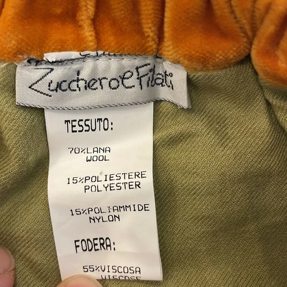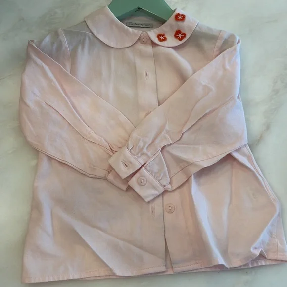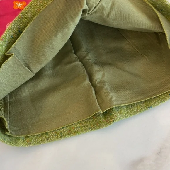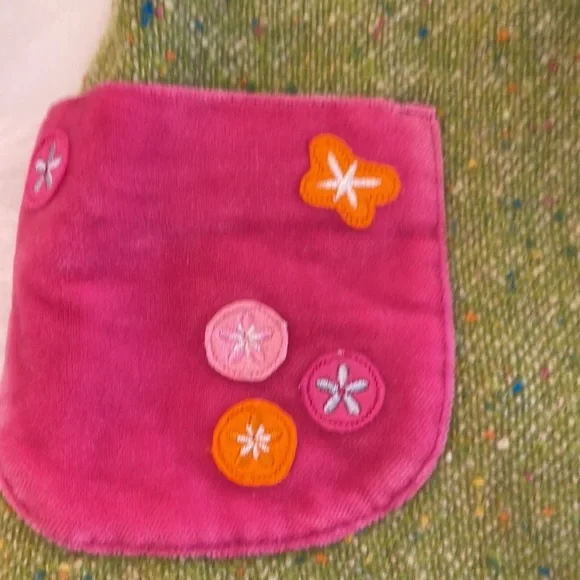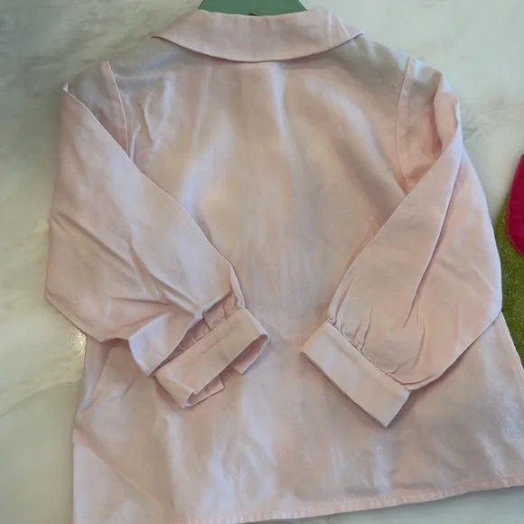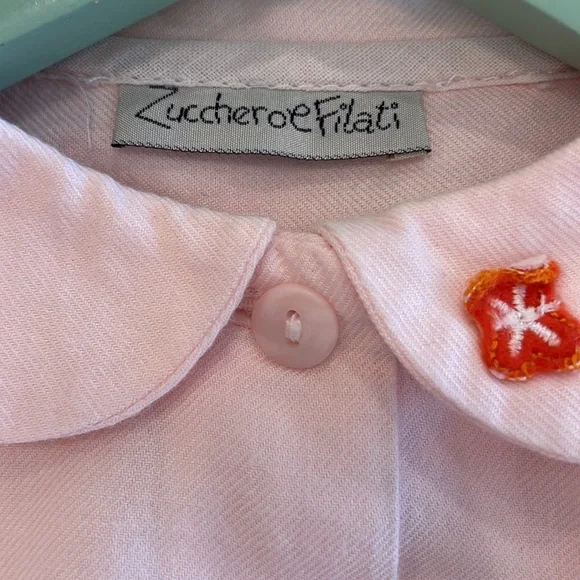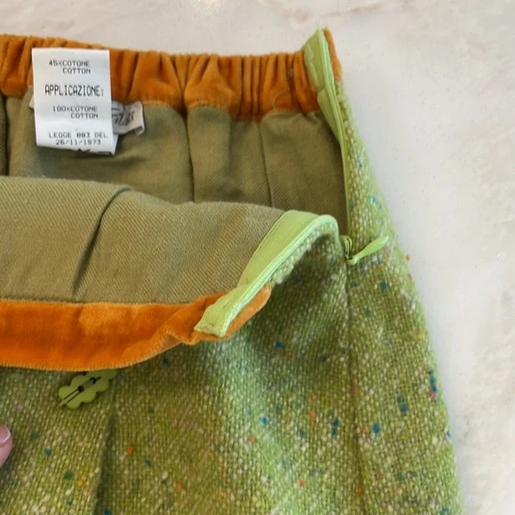 Made In Italy •Brand New No Tags• 2 Piece Set with Pink cotton button down blouse with orange butterfly details sewn on Peter Pan collar• Green tweed skirt with multi colored speckles throughout• with 1/2 elastic waist and size zipper• orange velvet trim around waist• pink velvet pocket on right side of skirt with orange and pink butterfly and floral details sewn on•left side by slit has 3 wooden leaf beads sewn on and do not open slit• green cotton lining• size 2Both pieces are brand new no stains at all•