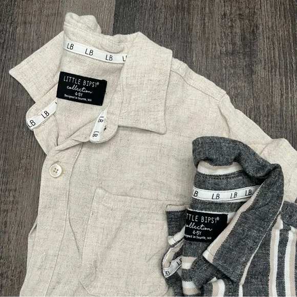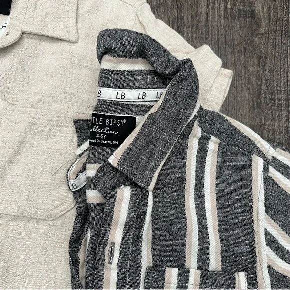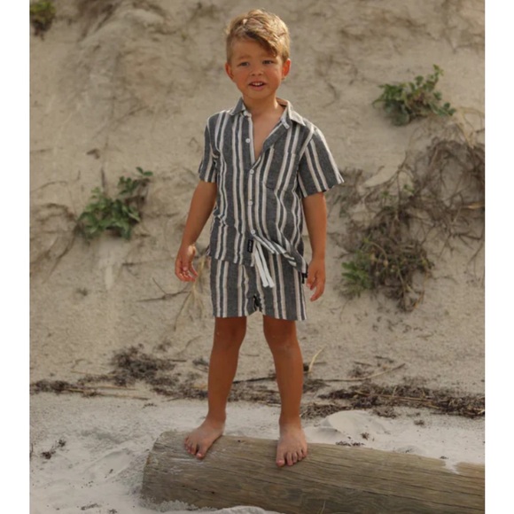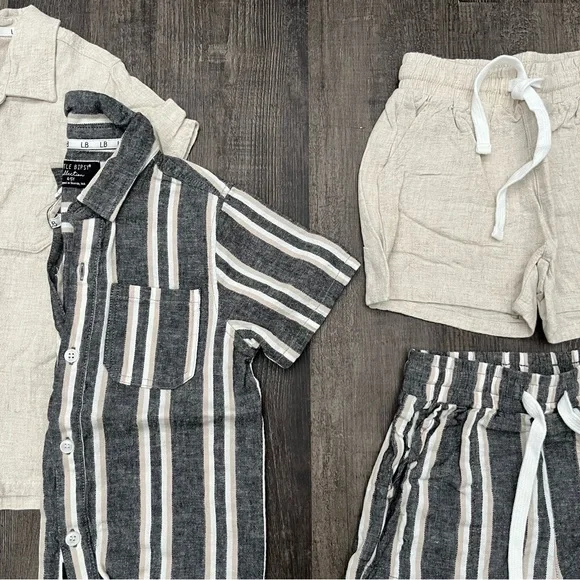 Chic shirt set with gray and cream stripes. Ideal for everyday wear.Can mix and match pieces to create several outfits! Linen material.
