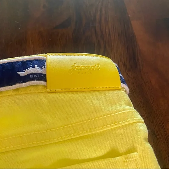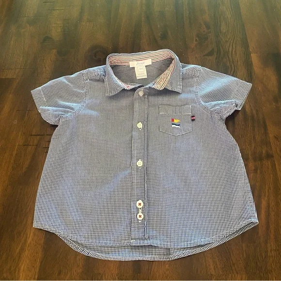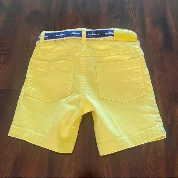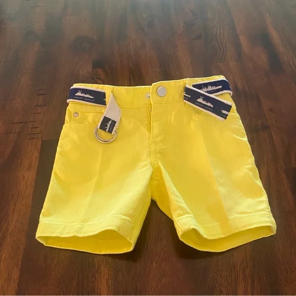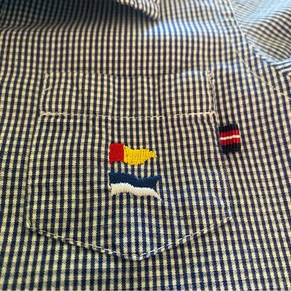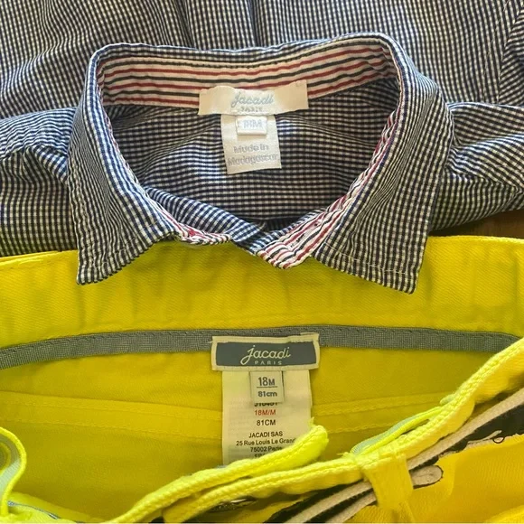Super Cute Jacadi Paris Boys Yacht Collection Set at beautiful Blue and White Squares print with embroidered boat on the left pocket and short sleeves and Matching Yellow shorts with elastic bands inside and removable boat belt. Used twice but in excellent condition. Size 18 Months