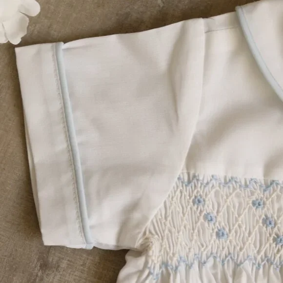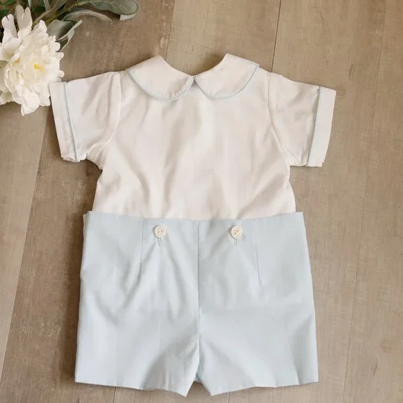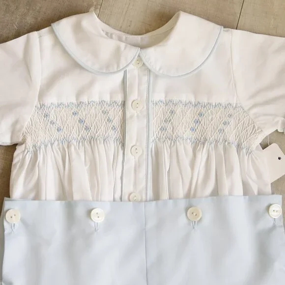 This Smocked Baby Boy´s Bobby Suit is ADORABLE! The top is done in White and the shorts are done in Pastel Blue. The short sleeve top has sweet smocking across the bodice adorned with a matching White and Blue embroidery. A button closure placket at the center of the shirt has pearlized buttons and is trimmed in a matching Blue piping. The Perter Pan collar keeps the outfit traditional and is trimmed in a matching Blue piping also. The short sleeves have a sewn cuff that is trimmed in Blue piping. The Blue shorts attach to the front and back of the shirt with larger matching buttons. A snap inseam makes for easy changing. Add white knee socks and Blue saddle or White oxfords for a Classic formal/dressy style. Perfect for weddings, Baby Ring Bearers, Portraits, church or other Special Events. Brand New WithTags!!Size 12 Months10.5" across chest from underarm seam to seam8.5" across top of back (shoulder seam to seam)14.5" from top of back neck to center of short´s inseamshorts11" across waist (has stretch due to elastic)8" long from waist to bottom of leg hemSize 18 Months11" across chest 9" across top of back 15.5" from top of back neck to center of short´s inseamshorts11.5" across waist (has stretch due to elastic)8.5" long from waist to bottom of hemSize 24 Months11.75" across chest 9.5" across top of back 16.5" from top of back neck to center of short´s inseamshorts12" across waist (has stretch due to elastic)9" long from waist to bottom of hem