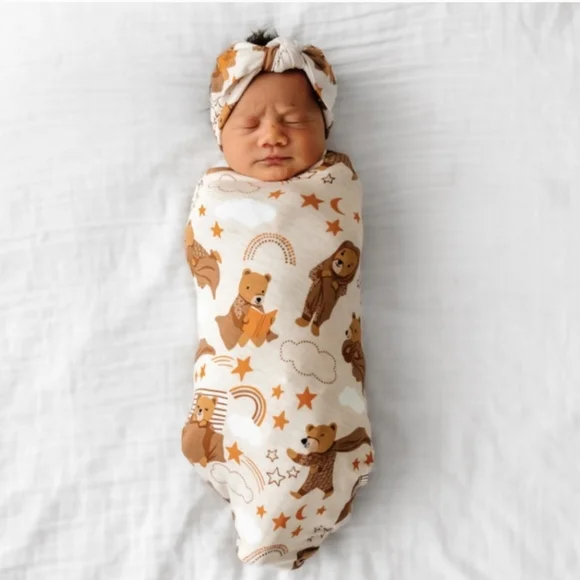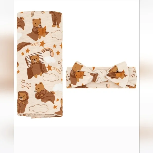 Brand New and unopened!Print: Beary SleepySOLD OUT ON SITECrafted with buttery soft, stretchy, custom-milled Lunaluxe™ Bamboo that´s gentle on sensitive or eczema-prone skinSeasonless fabric to prevent your newborn from overheating in the summer and keep them warm and cozy in the winterSwaddle measures 44" X 44"Swaddle can be used as a car seat cover, nursing wrap, stroller shade, burp cloth, play mat, and moreSecured knotted bow headband fits from newborn to age three (knot cannot be adjusted)Bow dimensions are approximately 3 1/4" high and 4 1/2" widePackaged in our signature peekaboo gift box * For children’s safety, headbands should never be worn while sleeping.