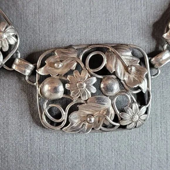 A WOMENS VINTAGE ESTATE STERLING SILVER FLORAL FILIGREE BIB NECKLACE .THE NECKLACE WEIGHS 30.5g, AND MEASURES 15 1/4" LONG BY 1" WIDE.THIS WOULD MAKE A NICE GIFT FOR THAT SOMEONE SPECIAL.ANY QUESTIONS, PLEASE DO NOT HESITATE TO ASK.BE SURE TO CHECK OUT SOME OF MY OTHER GREAT ITEMS UP FOR SALE. THANK YOU.
