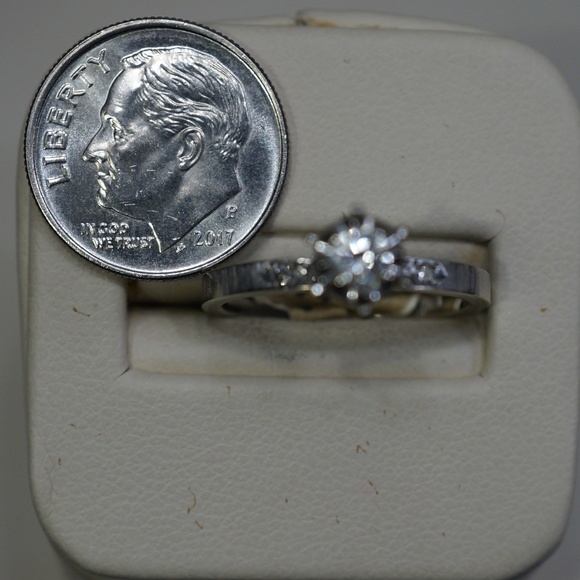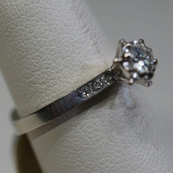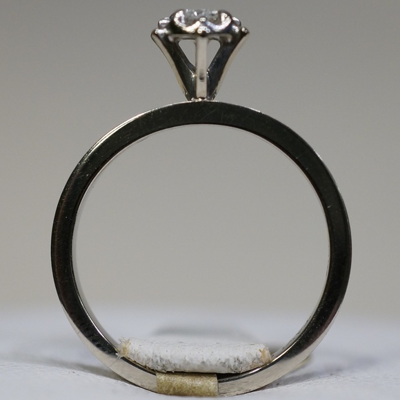 NWT 14kw gold engagement ring with 1/5 carat round brilliant cut genuine diamond set in a illusion head and 2 small round diamonds bead set on each side of center stone.Ring is a...