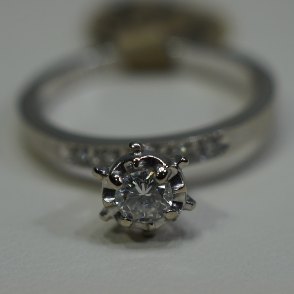 NWT 14kw gold engagement ring with 1/5 carat round brilliant cut genuine diamond set in a illusion head and 2 small round diamonds bead set on each side of center stone.Ring is a size 6.