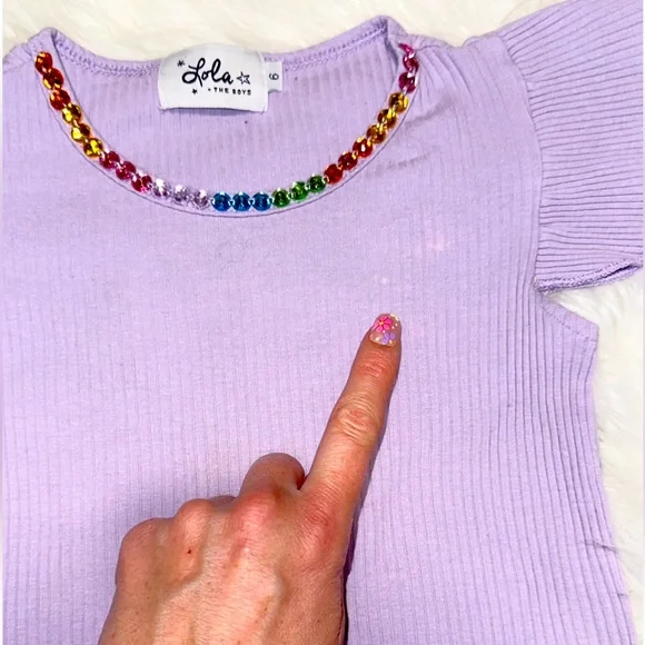 Lavender tee adorned with vibrant gem accents around the neckline. Adds a playful touch to any look.See pics- has a spot near necklineMarked as 5T as it fits small! Tag says size 6, though