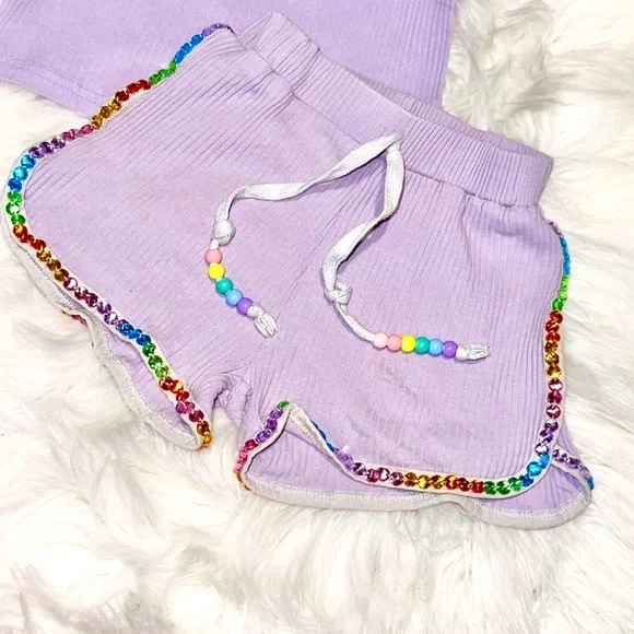 Lavender tee adorned with vibrant gem accents around the neckline. Adds a playful touch to any look.See pics- has a spot near necklineMarked as 5T as it fits small! Tag says size...
