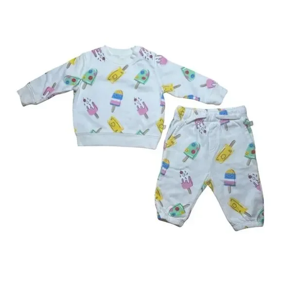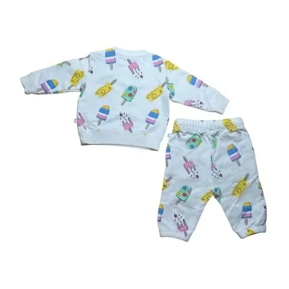 Stella sweatsuit, white with ice lolly print - size 6m. Drawstring, front patch pockets, close-fitting at ankles. Elasticated waist, sewn-in brand label, tie fastening. Please see photos for overall excellent condition. Little to no signs of wear. Comes from pet and smoke free home. Any questions, please ask!
