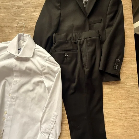 Toddler 4 piece tuxedo size 5T.Elegant black suit set by Tallia. Includes sport coat and pants, white collared shirt and black adjustable bow tie. Ideal for formal events, ring...