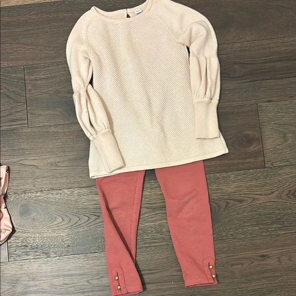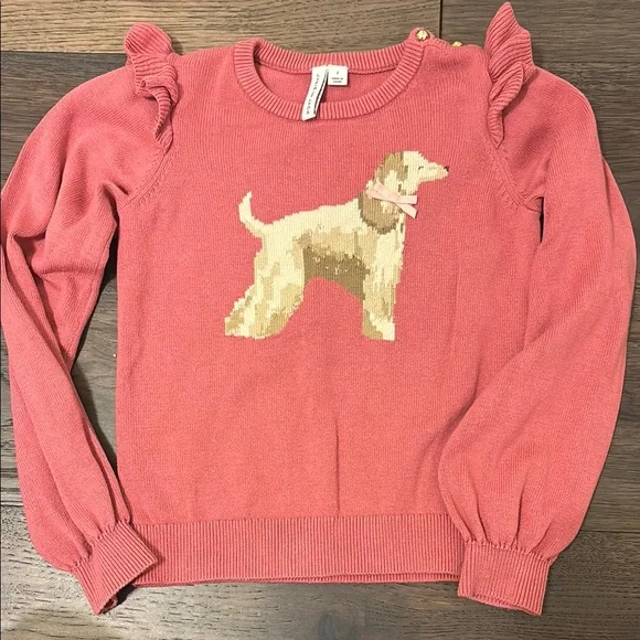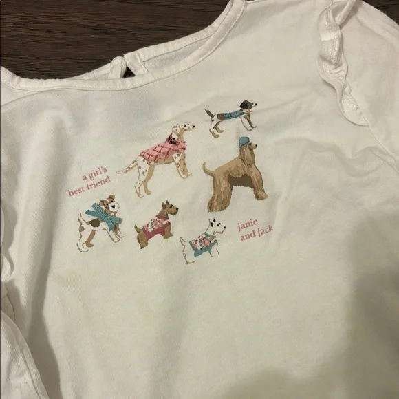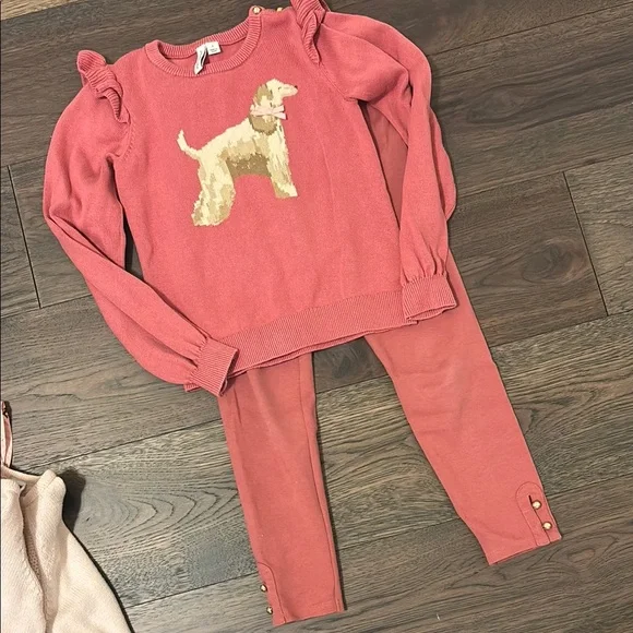Janie and Jack girls´ clothing set featuring the sold out puppy/dog designs. Pants and tops for mix and match wear - from casual to slightly dressed up this lot has it all. Set includes:-Ponte pants with gold buttons-Waffle knit dainty sweater -‘Best friend’ dog seater with bow and ruffle detail-Dog print ruffle blouse-Two long sleeved tees -navy blue leggings with side stripes Size 7 Ships from smoke free home