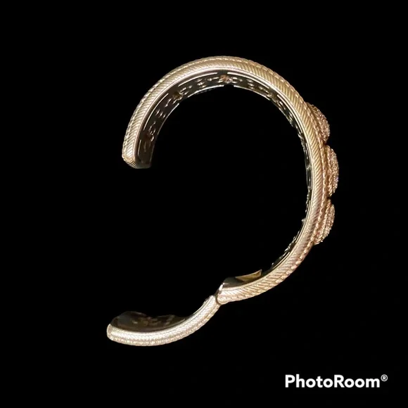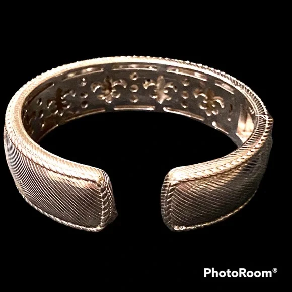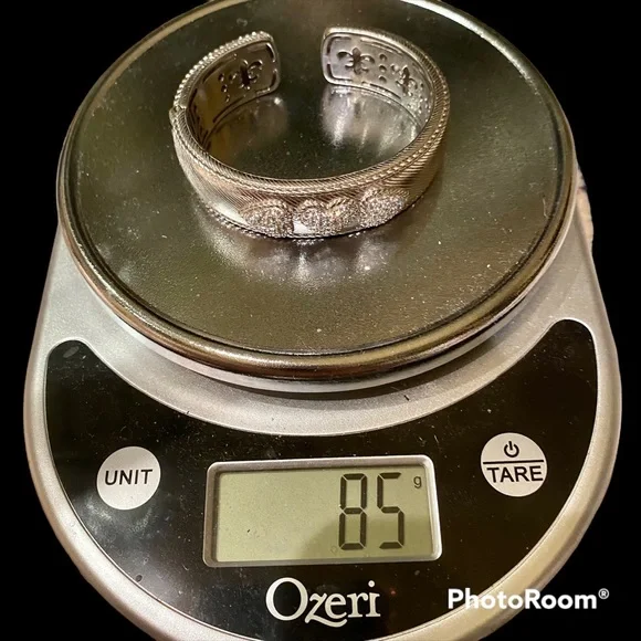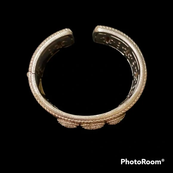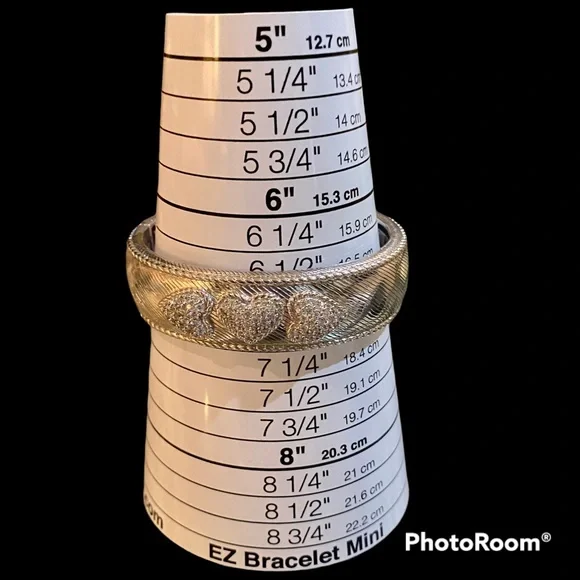 Judith Ripka Sterling Silver Hinged Bracelet of bracelet with three large hearts covered in diamonique cz’s. See photos for weight and measurement.