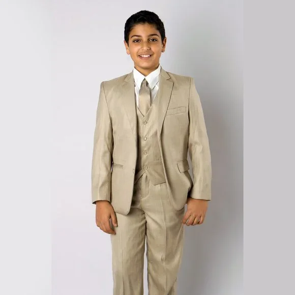 Looking for a stylish and classic suit for your little boy? Look no further than our Boys 5-Piece Beige Suit, complete with a Notch Lapel. This set includes matching trousers, vest, and tie to complete the look. And to top it off, it comes with a brown dressing shirt to add a touch of sophistication to any occasion. Expertly crafted with high-quality materials, this suit is perfect for weddings, formal events, or any special occasion where your little man needs to dress to impress. Order now and give your little one a stylish and memorable look that they´ll cherish for years to come!BrandAZZURO (Private Label)JacketSingle BreastedNotch LapelSolidTwo Button Front ClosureSide PocketsChest PocketVestFour ButtonSolidPantsRegular FitSolidTraditional Length