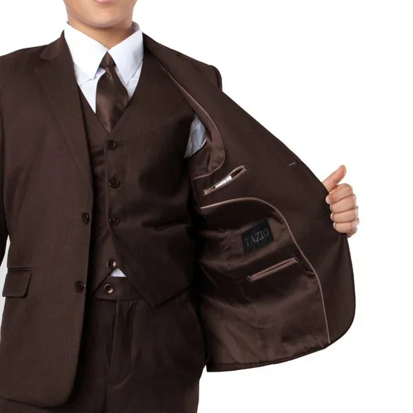 Looking for a stylish and classic suit for your little boy? Look no further than our Boys 5-Piece Brown Suit, complete with a Notch Lapel. This set includes matching trousers, vest, and tie to complete the look. And to top it off, it comes with an off-white dressing shirt to add a touch of sophistication to any occasion. Expertly crafted with high-quality materials, this suit is perfect for weddings, formal events, or any special occasion where your little man needs to dress to impress. Order now and give your little one a stylish and memorable look that they´ll cherish for years to come!BrandAZZURO (Private Label)JacketSingle BreastedNotch LapelSolidTwo Button Front ClosureSide PocketsChest PocketVestFour ButtonSolidPantsRegular FitSolidTraditional Length