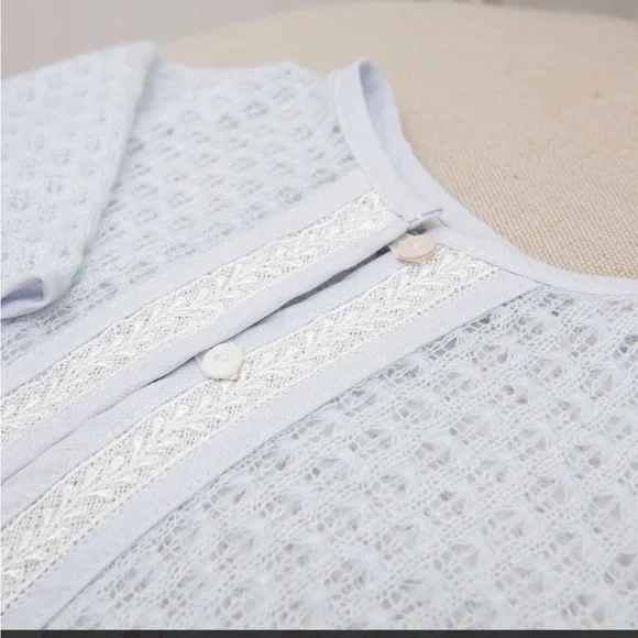 Baby Beau & Belle Harrison Sweater 3-Piece Pant Suit Includes: Sweater, Pants & OnesieSize 6-9 monthsHandmade in the USAThis adorable baby boy 3-piece suit is a beautiful option for his special day! The pants are designed with a textured 100% white cotton with an adorable pleated detail. A soft elastic waist creates an easy fit. The blue knit sweater is super soft and detailed with ivory lace and blue linen. The cotton/rayon blend shirt underneath is super soft, making this an outfit he will be comfortable in all day. The perfect baby boy wedding outfit or baby boy suit for special occasions such as baptism, christening, or first birthday pictures! Your dapper dude will look dashing in all those pix you´ll be snapping.100% White Quilted CottonLight Blue KnitWhite Cotton/Rayon Blend ShirtIvory LaceButton Closure & Detail