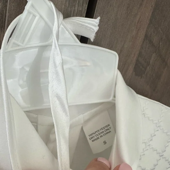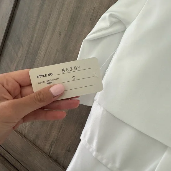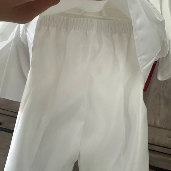 Brand new, purchased from an Italian boutique. 4 pieces (pants, shirt, vest and bonnet)Size small is 6-9 monthsBeautiful, elegant, and precious