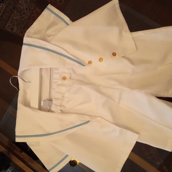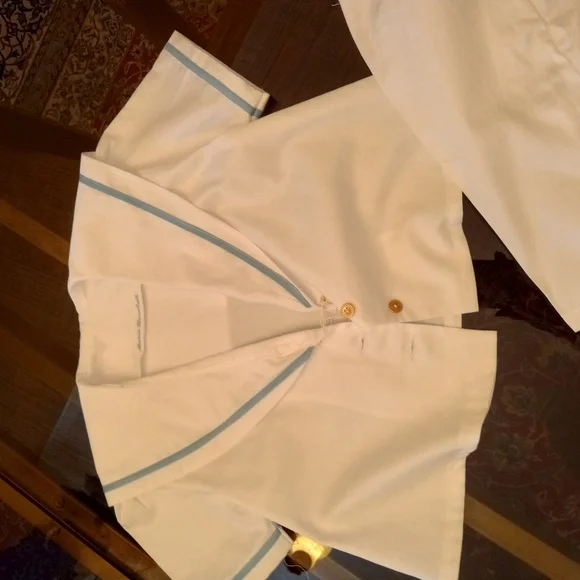 White Button-Up Shirt with Blue Trim