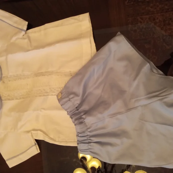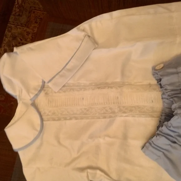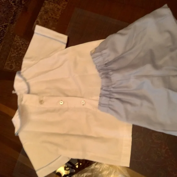 This charming kids shirt set features a classic white top with delicate detailing and a soft blue bottom. Perfect for any occasion, this set combines comfort and style effortlessly.