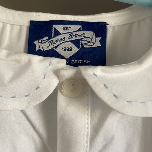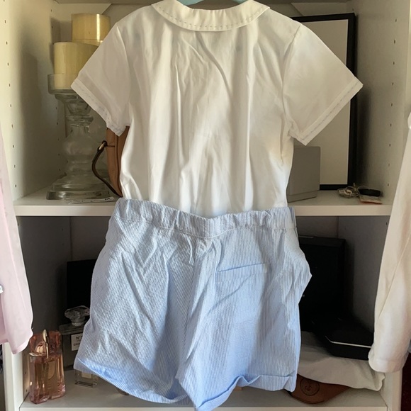 White linen short sleeve shirt which fastens concealed buttons to a classic pair of shorts. Worn once.
