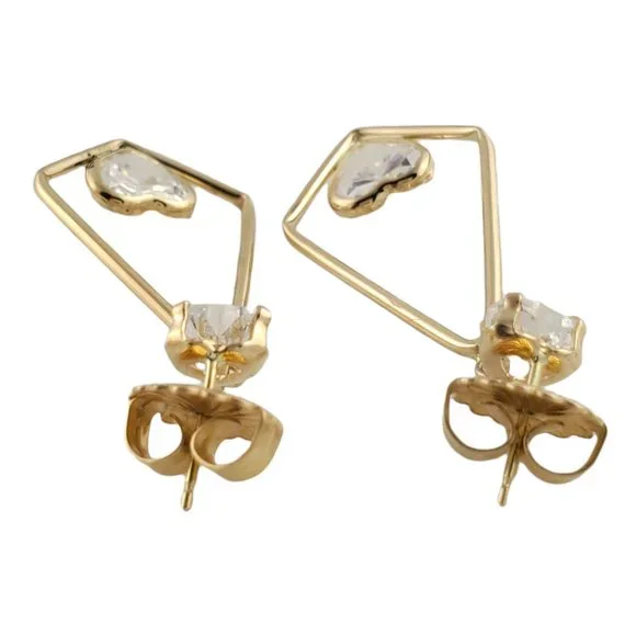 Vintage 14K Yellow Gold Dangle Cubic Zirconia Heart EarringsGorgeous pair of dangle earrings with beautiful cubic zirconia hearts!Size 18 mm X 43 mmWeight: 4.4 g/ 2.8 dwtHallmark:...