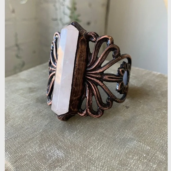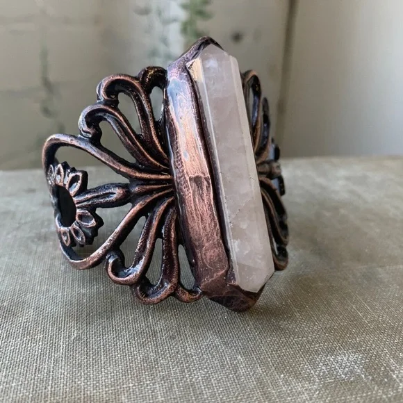 This stunning bracelet features a large pale pink rose quartz stone has been hand-set into an epoxy-sculpted setting and adhered to antique hardware that was fashioned into a cuff.The entire piece was then electroformed in copper and set with clear coat.Best for wrists 6"- 6.5"