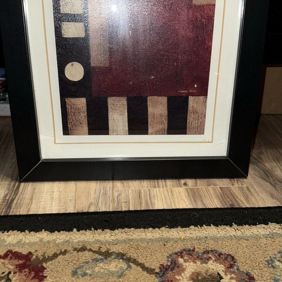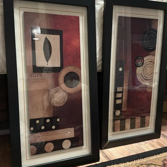 Pair of abstract art pieces with geometric patterns. Features shades of black, red, and brown. Perfect for modern interiors. They are bothsigned by Kimberly Poloson. BOTH PRINTS...