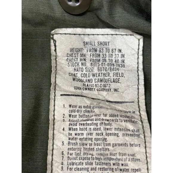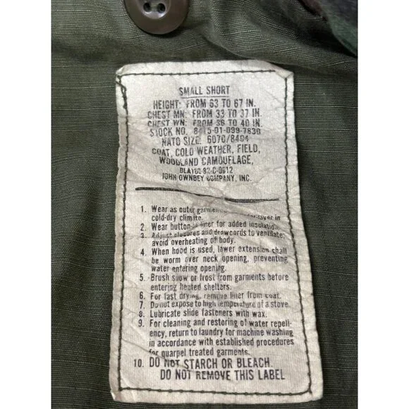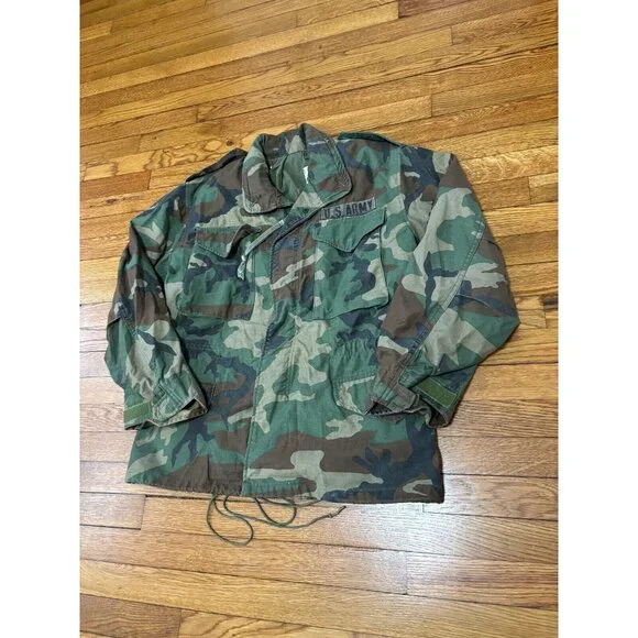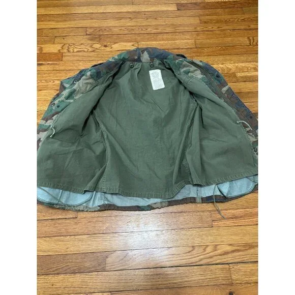 US Army Woodland Camo Field Jacket Coat Cold Weather Sz Small Short Green Canvas.Great pre owned condition! Little to no wear!Length 30"Pit to pit 21"Shoulder to wrist 24"Shoulder to shoulder 19.5"g3 12/4Check out our other items for sale!Follow our store to grab a great deal!!Thank you for viewing this item! We hope to provide you with quality photos, as well as honest and detailed descriptions. If we have left anything out and you have any questions, please send a message! All messages will be responded to promptly!*WE DO NOT OFFER FULL REFUNDS ON CLOTHING THAT DOES NOT FIT. MEASUREMENTS ARE PROVIDED TO ENSURE THAT THE ITEM FITS PROPERLY-PLEASE BE FAMILIAR WITH THE BRANDS YOU ARE BUYING-THANK YOU!