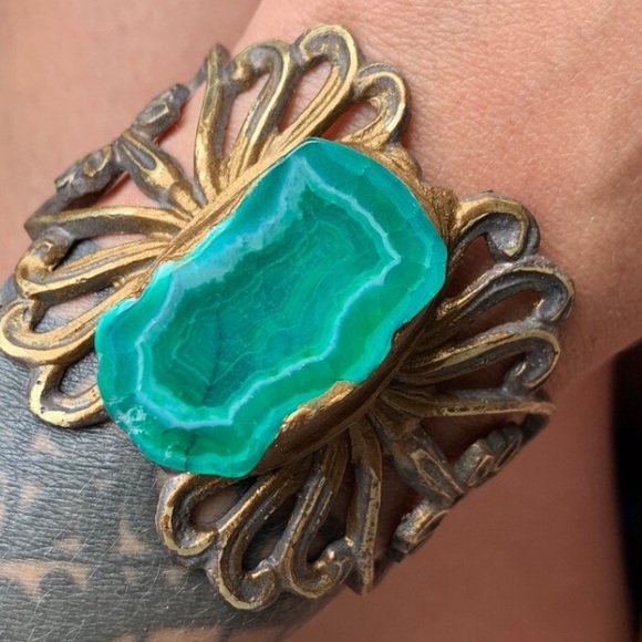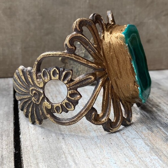 Cuff is an actual piece of antique hardware. Stunning green agate & antique brass cuff bracelet.Best for wrists up to about 6.5"Slightly adjustable