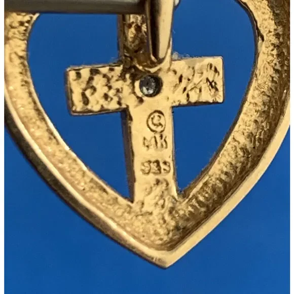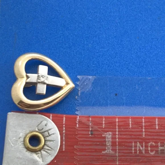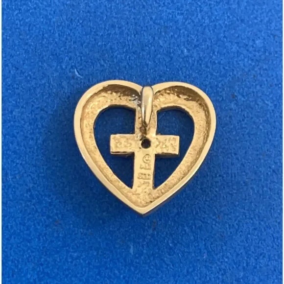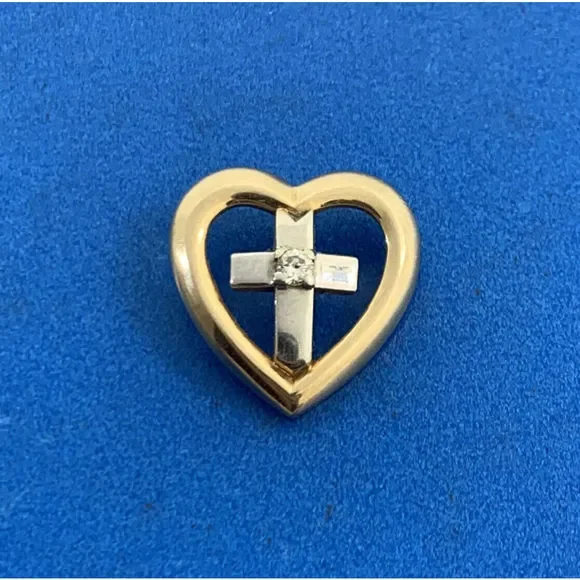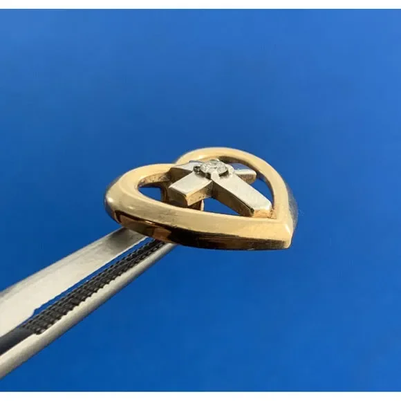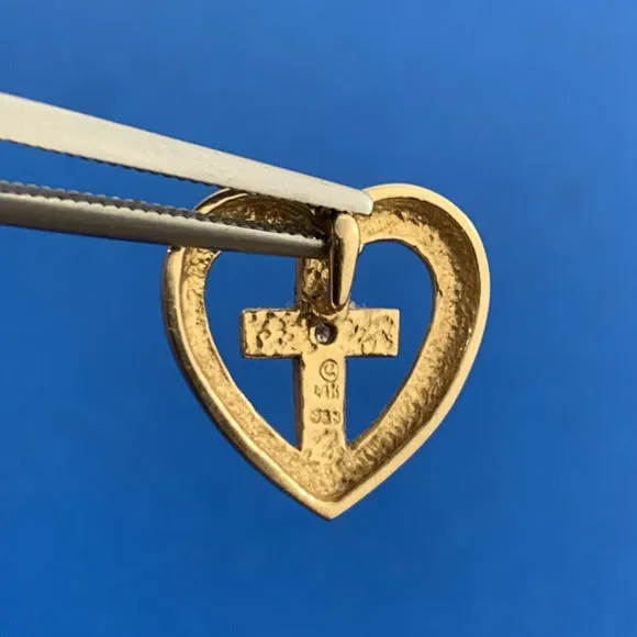 * Designer 14K Yellow White Diamond Cross Heart Religious Charm Pendant* Length: 5/8"* Width: 9/16"* One round Diamond measures approximately 1.65 mm * Weight: 2.4 tgw* Marked: MAKERS MARK * 14K * 585* Chain is not included, but can be purchased for an additional price* Condition: As pictured.* G3822