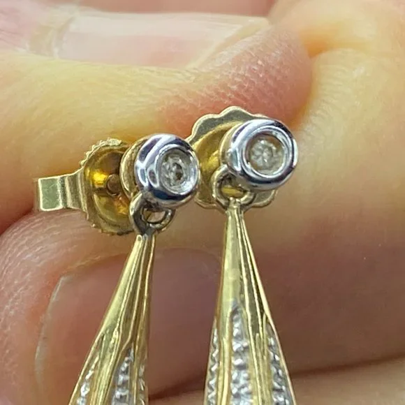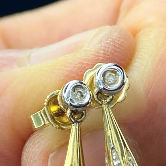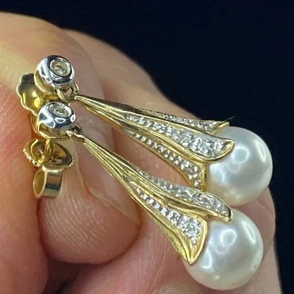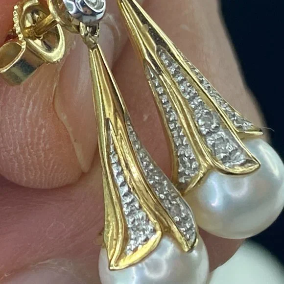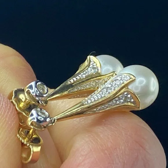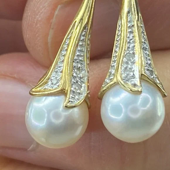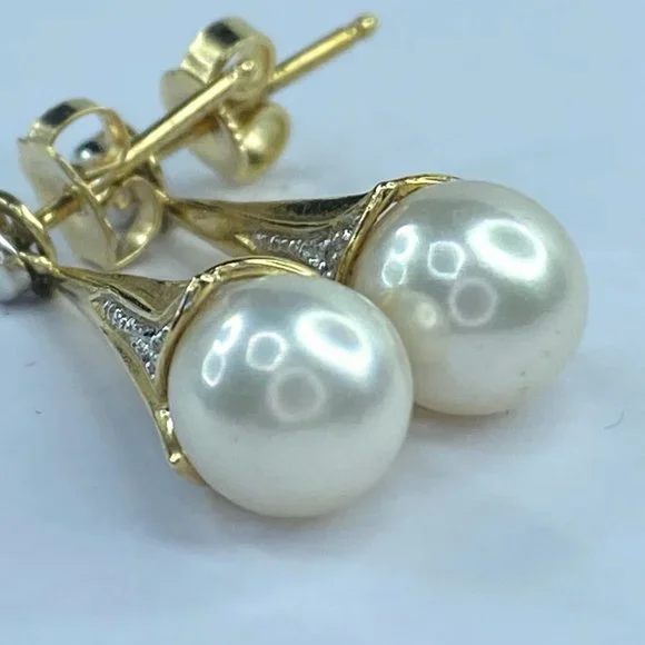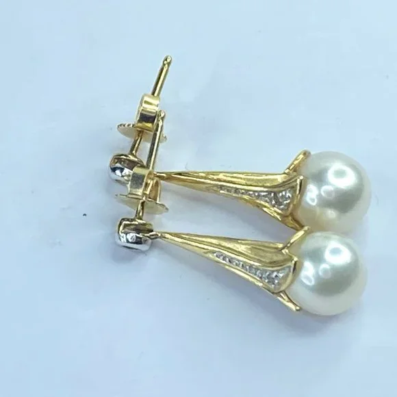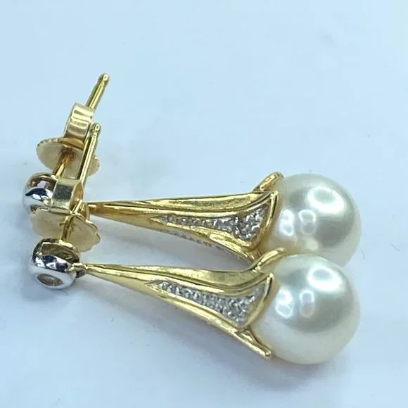 14K yellow gold 8.0mm cultured Pearl drop diamond earrings 1" 4.4gm